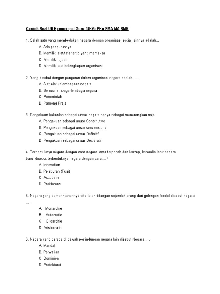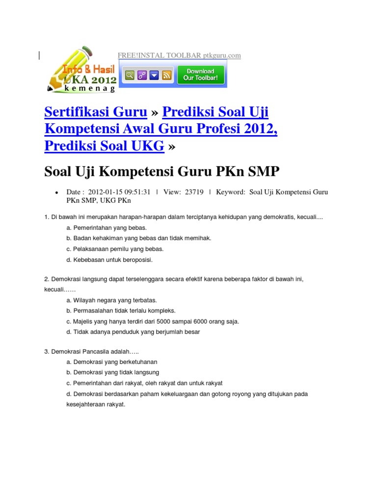 SOAL UKG SMK Soal Profesional SMK. CONTOH SOAL DAN JAWABAN UKG PKN SMP 2013Berikut ini contoh soal beserta jawaban Uji Kompetensi Guru PKn SMPPerhatian.